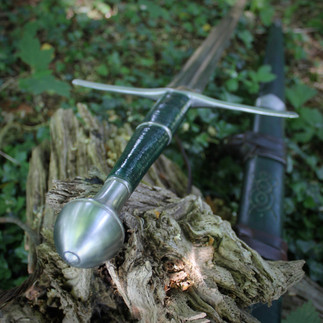A companion sword to the regal Amroth Arming Sword, this classic fantasy longsword takes cues from Strider's sword, combining a practical weapon fit for a ranger with clean, regal lines. The pronounced écusson allows our customer to comfortably thumb the blade in his practice of German techniques. It also provides a striking focal point, highlighting the broad fullers and sweeping out into angled diamond-section quillons. Please see our pricing structure for an idea of what a similar sword would cost.