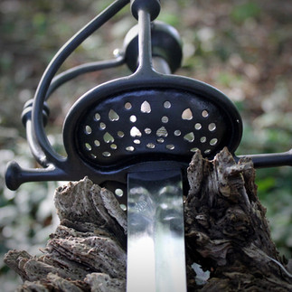 The hardened hilt features a thumb ring and dished piercework of hearts and circles, oil-blackened to a matte finish.