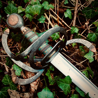 This ornate, folklore-inspired backsword was created as a custom order for a friend. It features extensive hand-engraving, copperwork and patina over a durable, hardened-steel hilt. While it is a thing of beauty, it is first and foremost a training tool, and has been meticulously designed to be robust, safe, and a delight to handle.